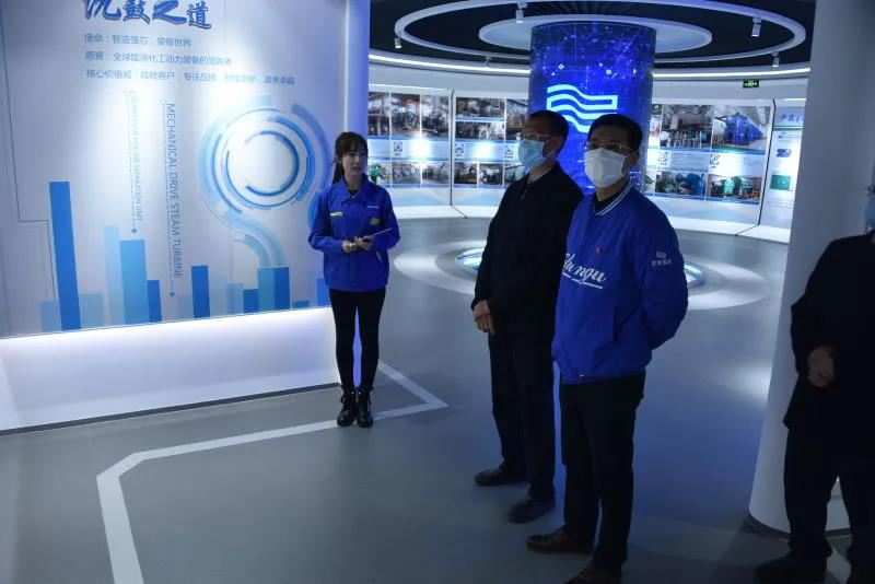 在张勇陪同下,韩晓军一行来到爱游戏在线登录官网企业展厅,饶有兴致的听取展厅宣讲员对沈鼓发展历程、主营业务、科技创新、客户服务等内容的介绍。随后,双方来到远程监测及故障诊断中心了解沈鼓云服务。